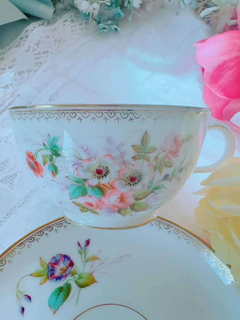 こちらはカップとソーサーにふんだんに花々が絵画のように描かれています。