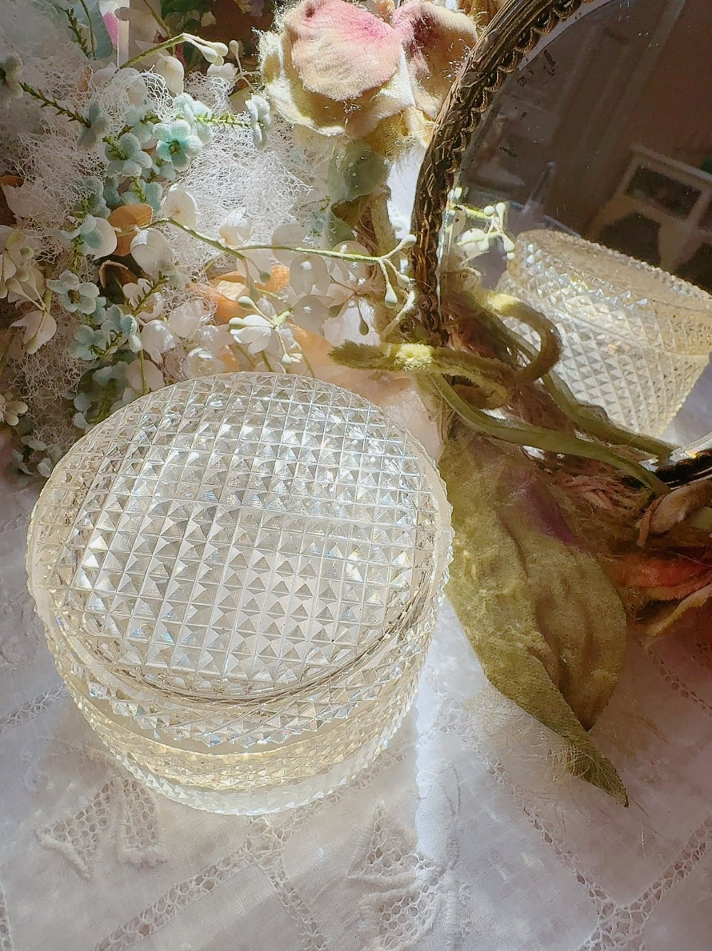 こちらは美しいピンクガラスのフタ付き小物入れは、細かな格子切りが施されており