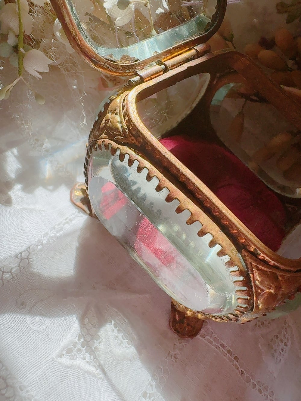 こちらのべべルガラスのジュエリーケースは、洗練されたデザインが魅力のお品です。美しいガラスの輝きと真鍮の細かな細工が目を引きます。収納したジュエリーを引き立てるだけでなく、インテリアとしても存在感があります。