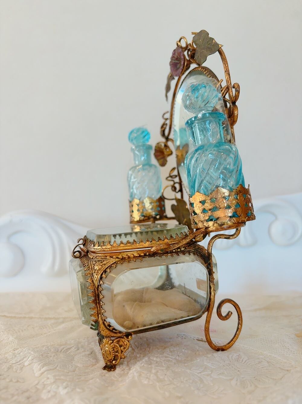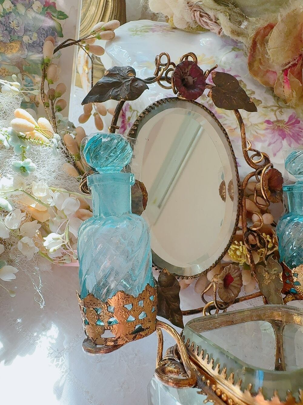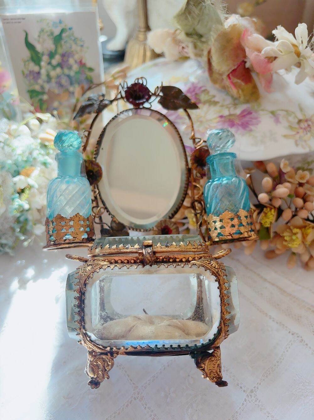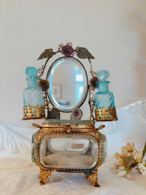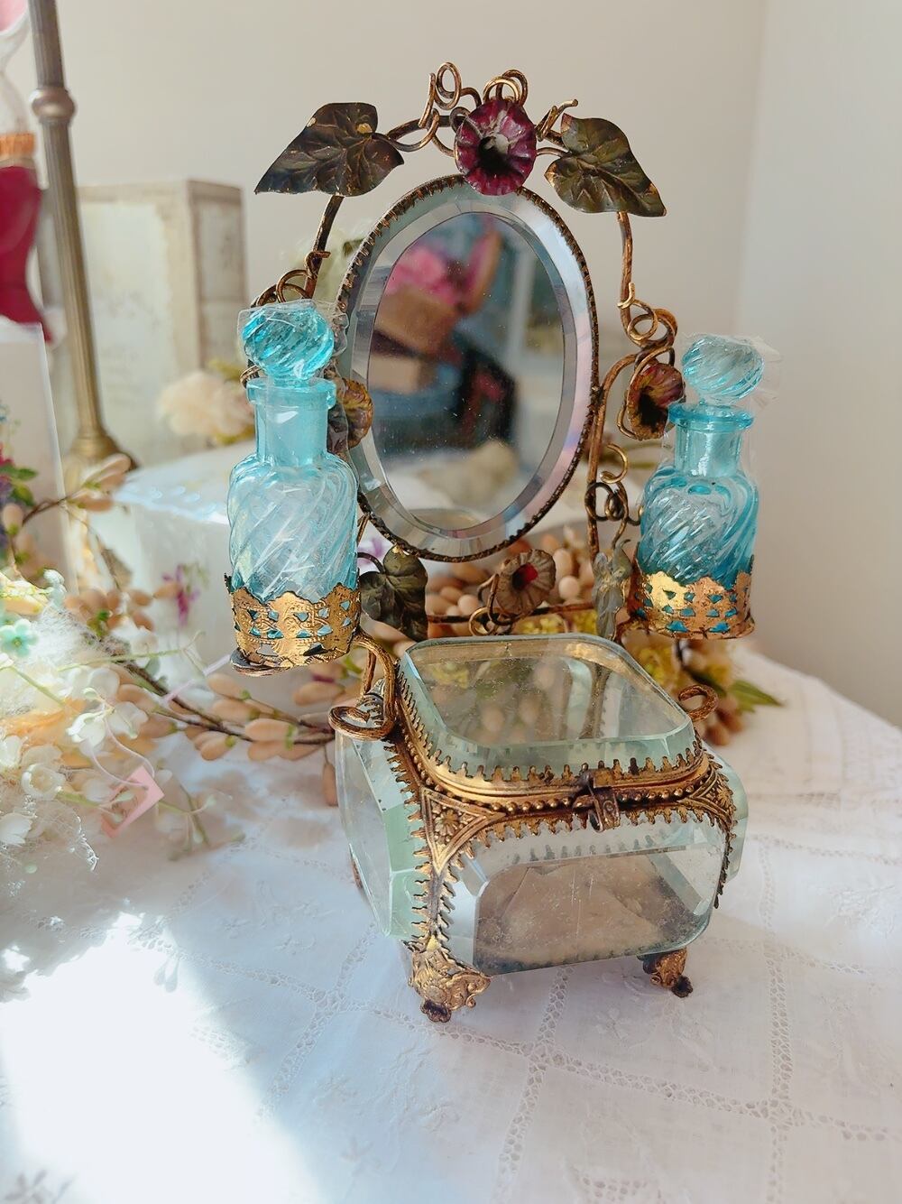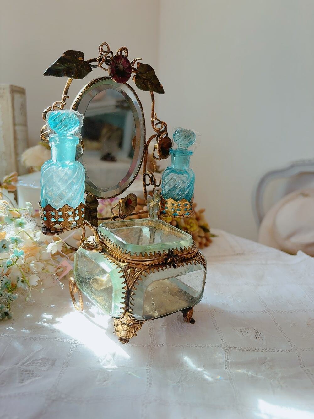 ジュエリーボックスの内側には柔らかなシルククッションが施されており大切なアクセサリーを優しく守ります。水色の可愛い香水瓶は元々付いていたオリジナルです。