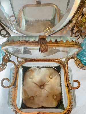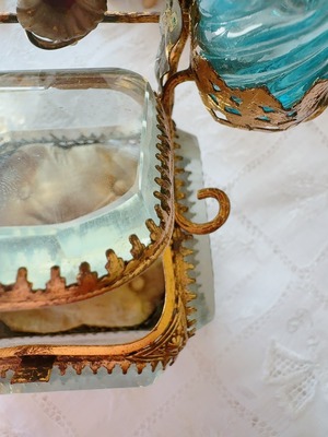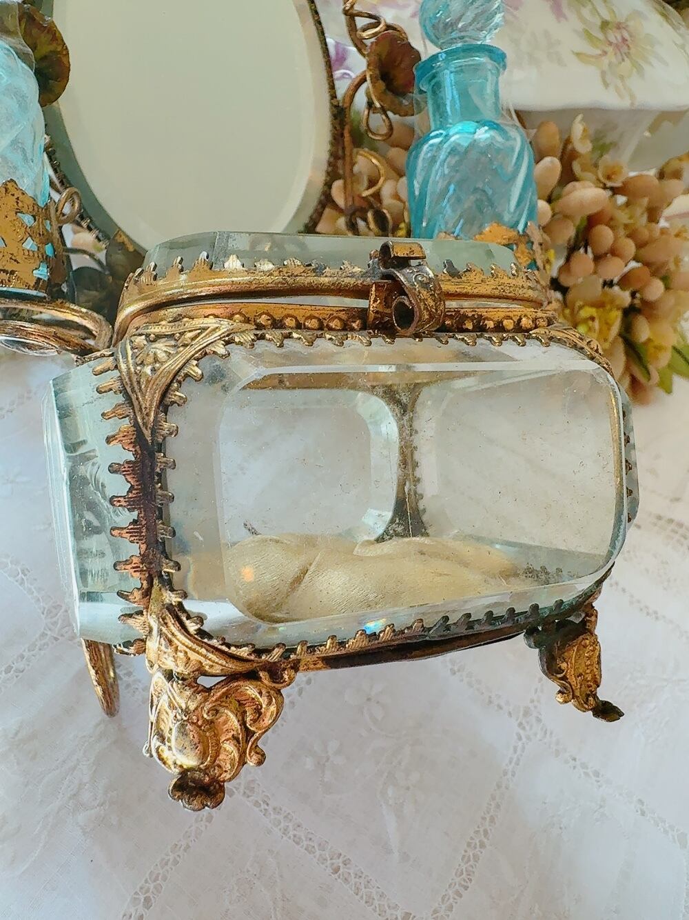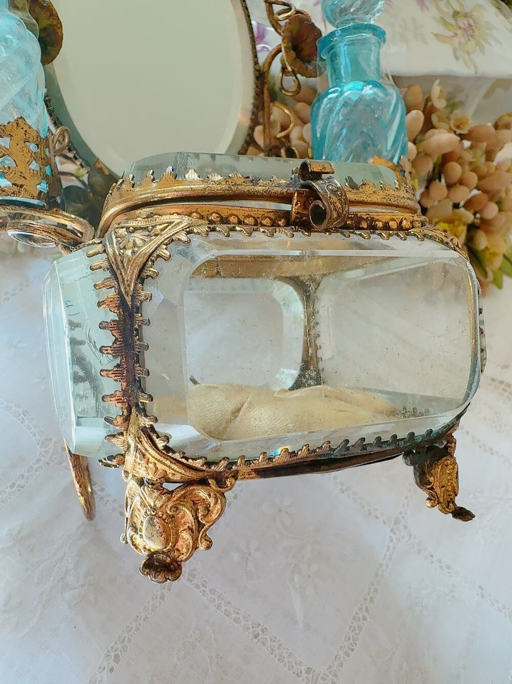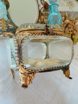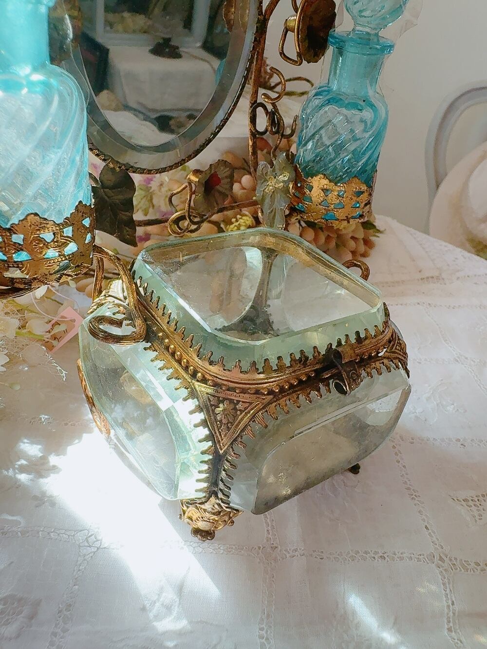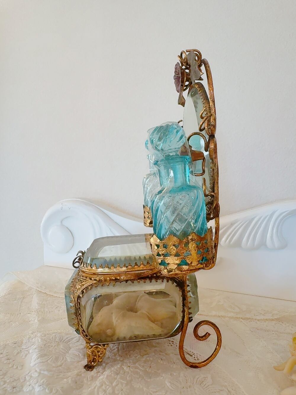 ジュエリーボックスの内側には柔らかなシルククッションが施されており大切なアクセサリーを優しく守ります。水色の可愛い香水瓶は元々付いていたオリジナルです。
