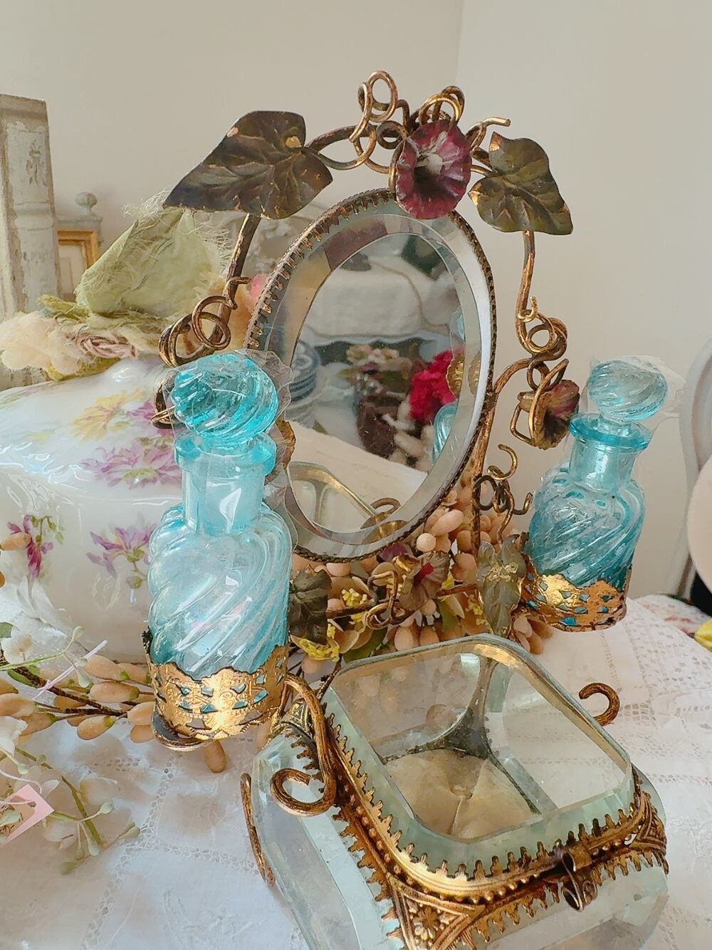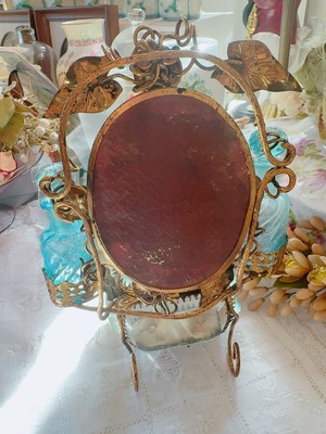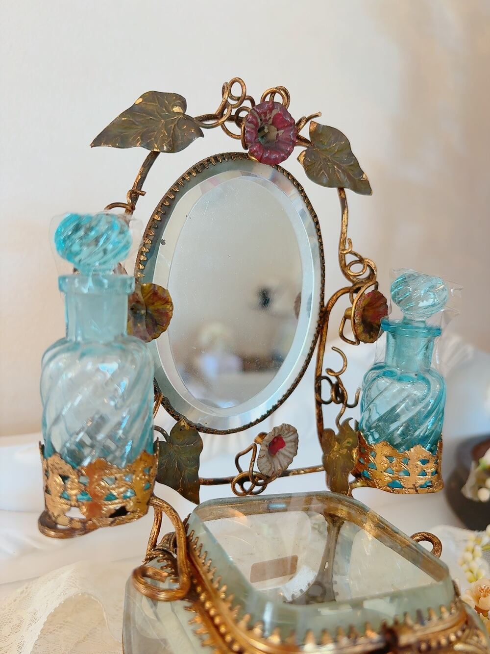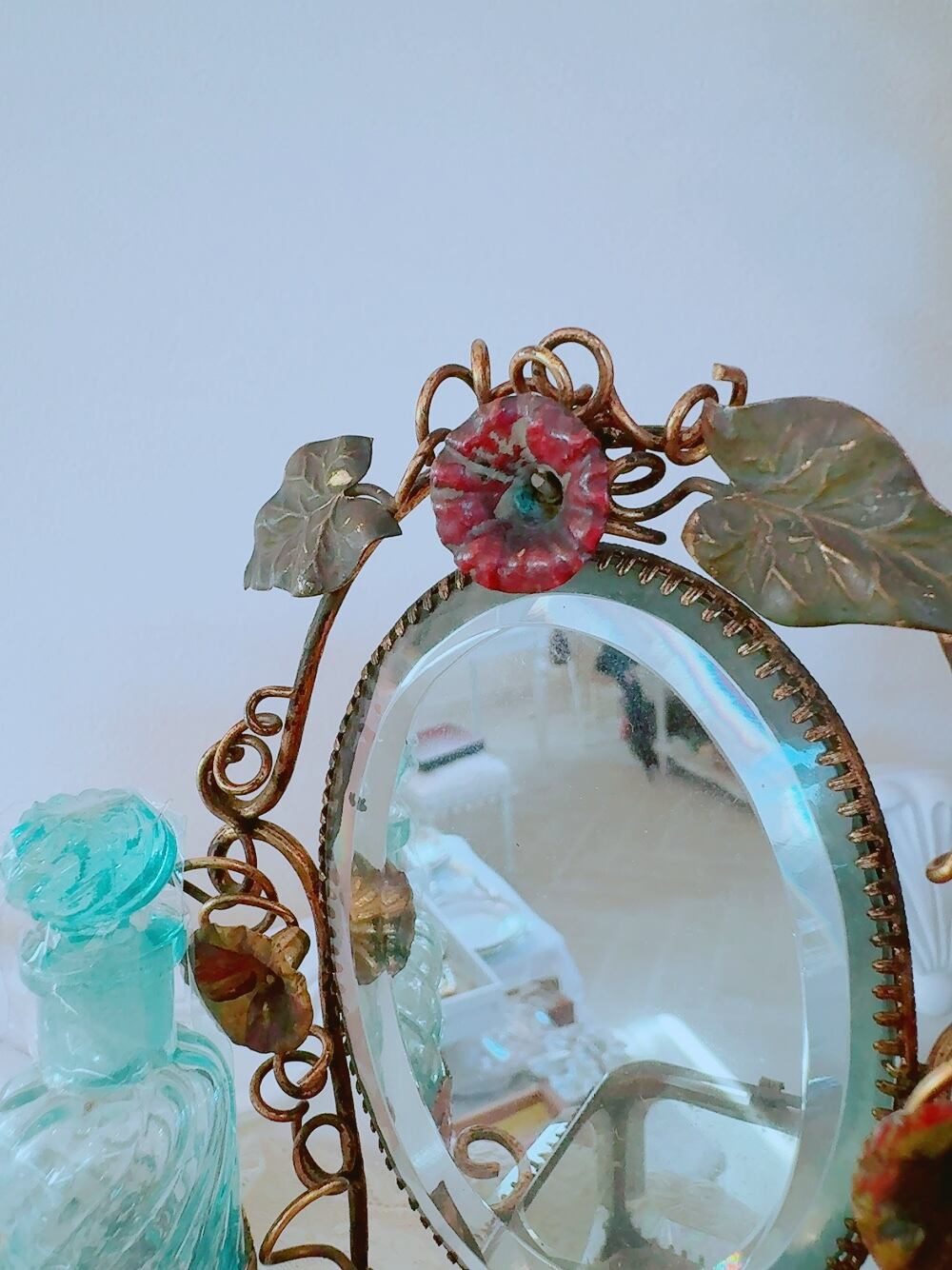 珍しいデザインが特徴のお品です。1920年代の物で独創的なデザインと美しい仕上げは、あなたの大切なジュエリーや香水を美しくディスプレイします。鏡の周りのアイアン花飾り少し赤色が残っていて長い年月を経てきたことが分かります。