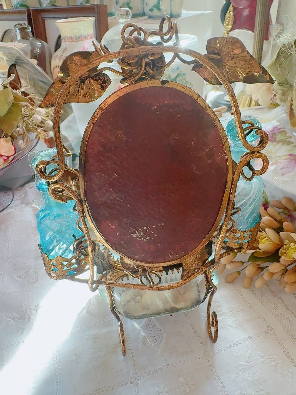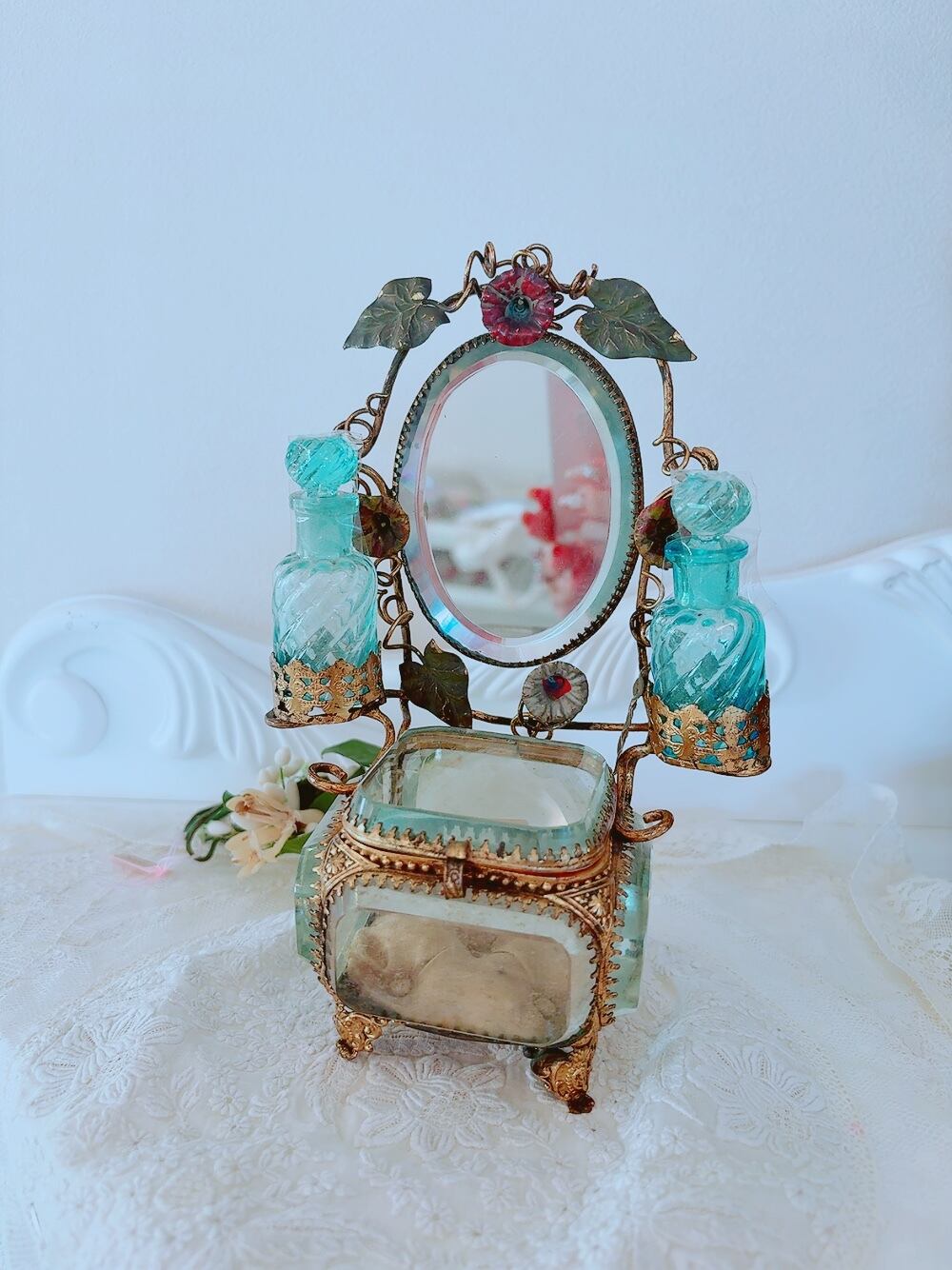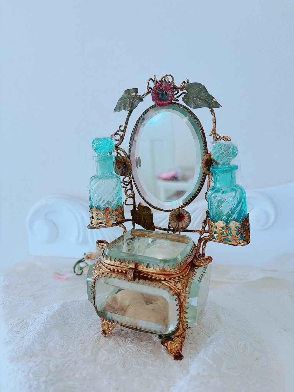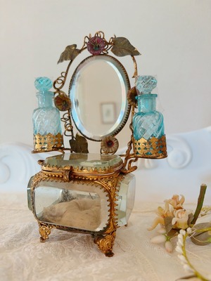珍しいデザインが特徴のお品です。1920年代の物で独創的なデザインと美しい仕上げは、あなたの大切なジュエリーや香水を美しくディスプレイします。鏡の周りのアイアン花飾り少し赤色が残っていて長い年月を経てきたことが分かります。