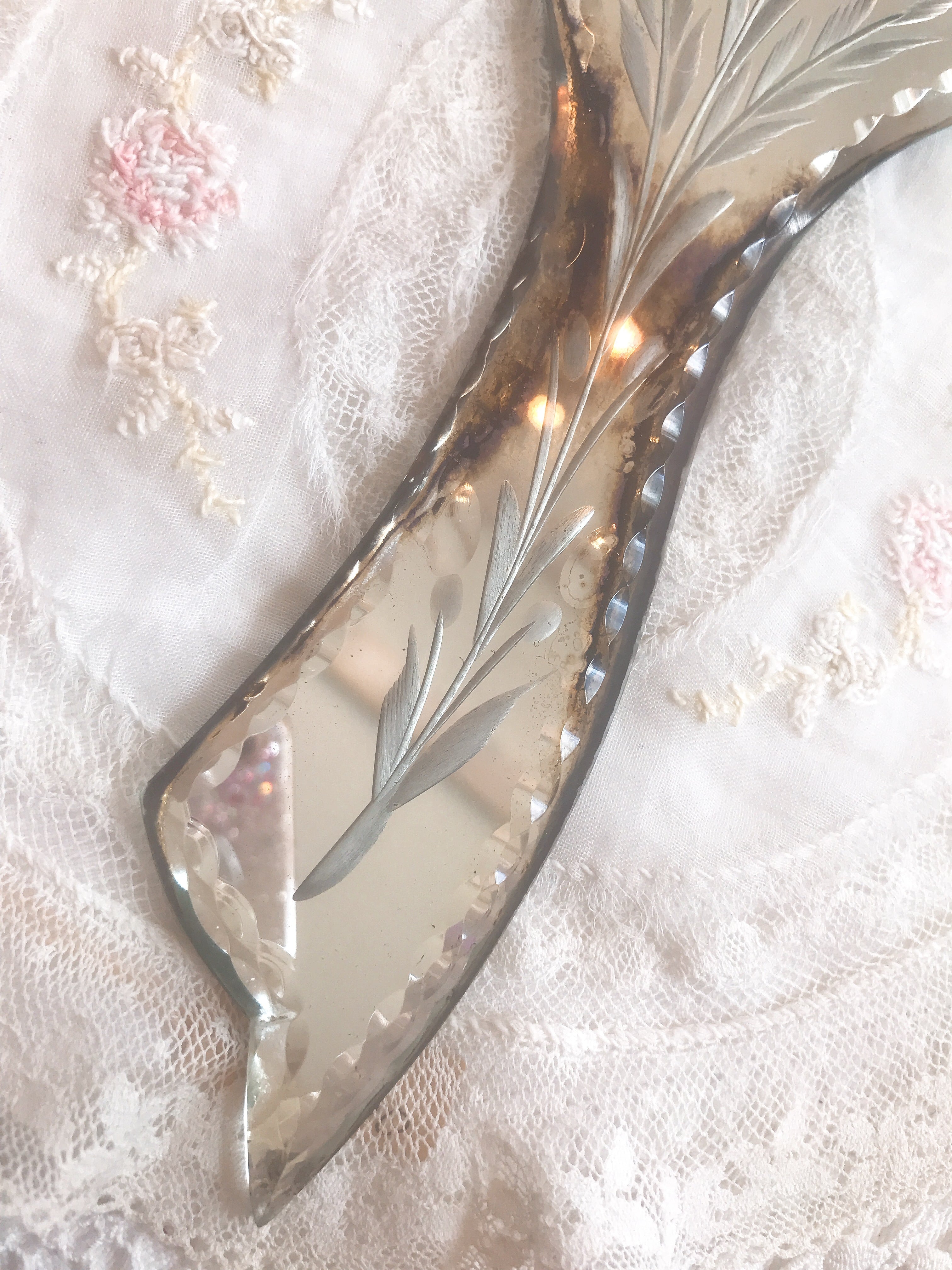 フランスのリヨンの蚤の市で見つけたカットが美しい鏡です。鏡の周りを綺麗にカットした持ち手も鏡になっていますが持ち手の部分が少し黒くなっています裏に少し削った跡があります。
