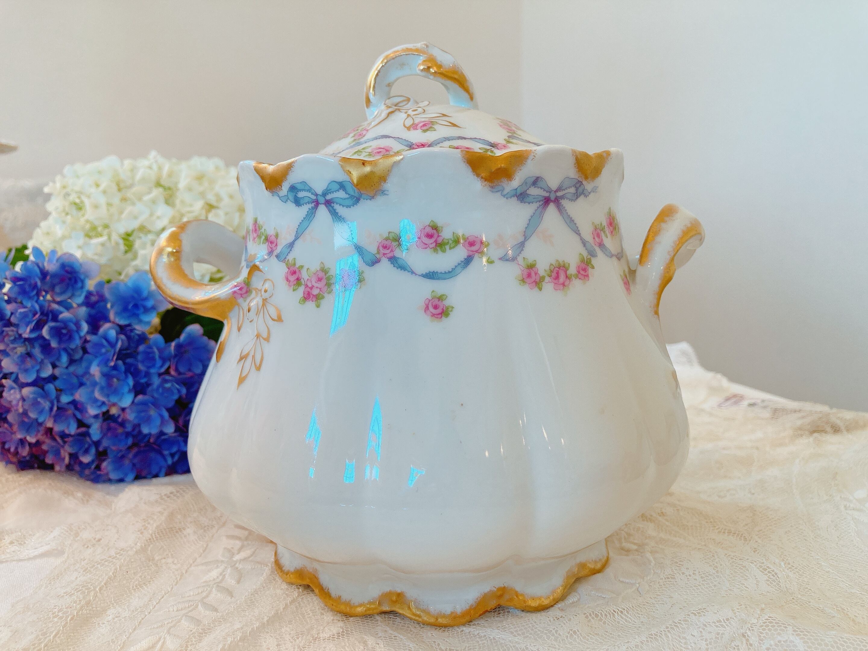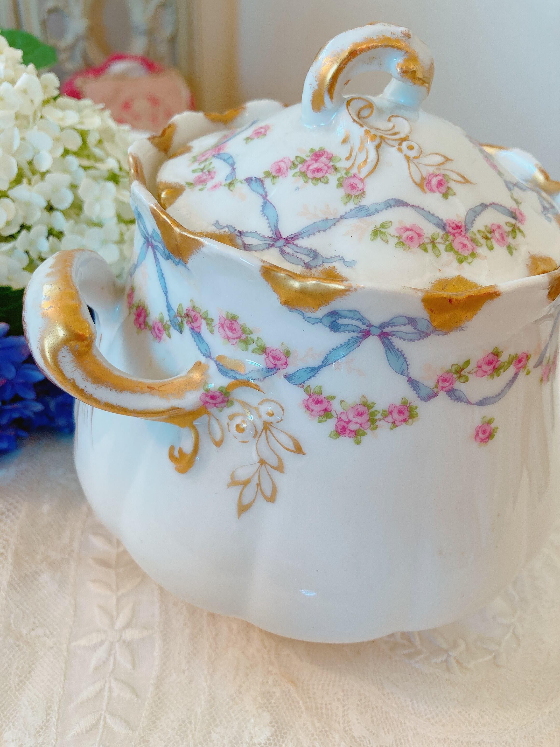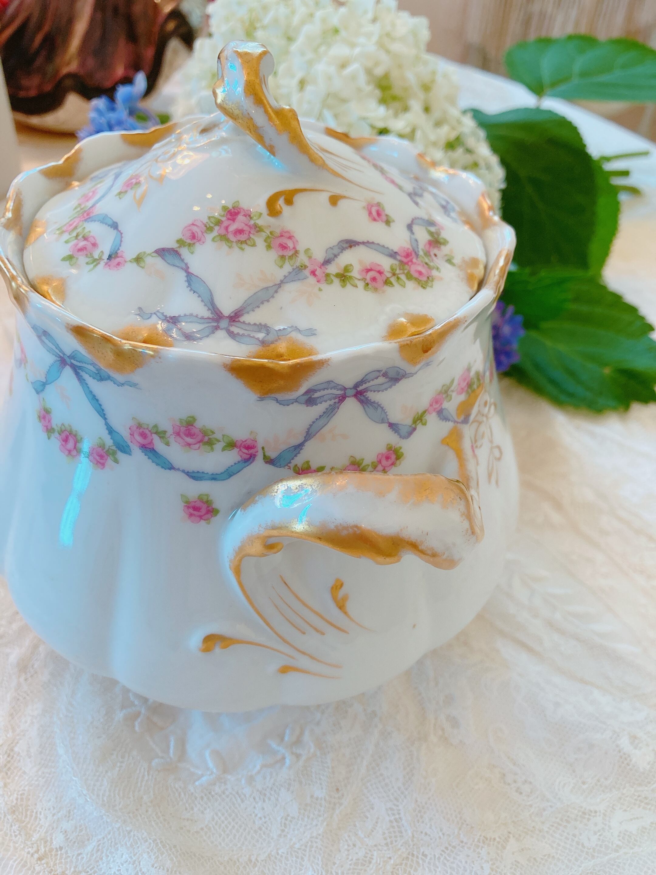 フランスリモージュ ブルーリボンと薔薇のシュガーポット