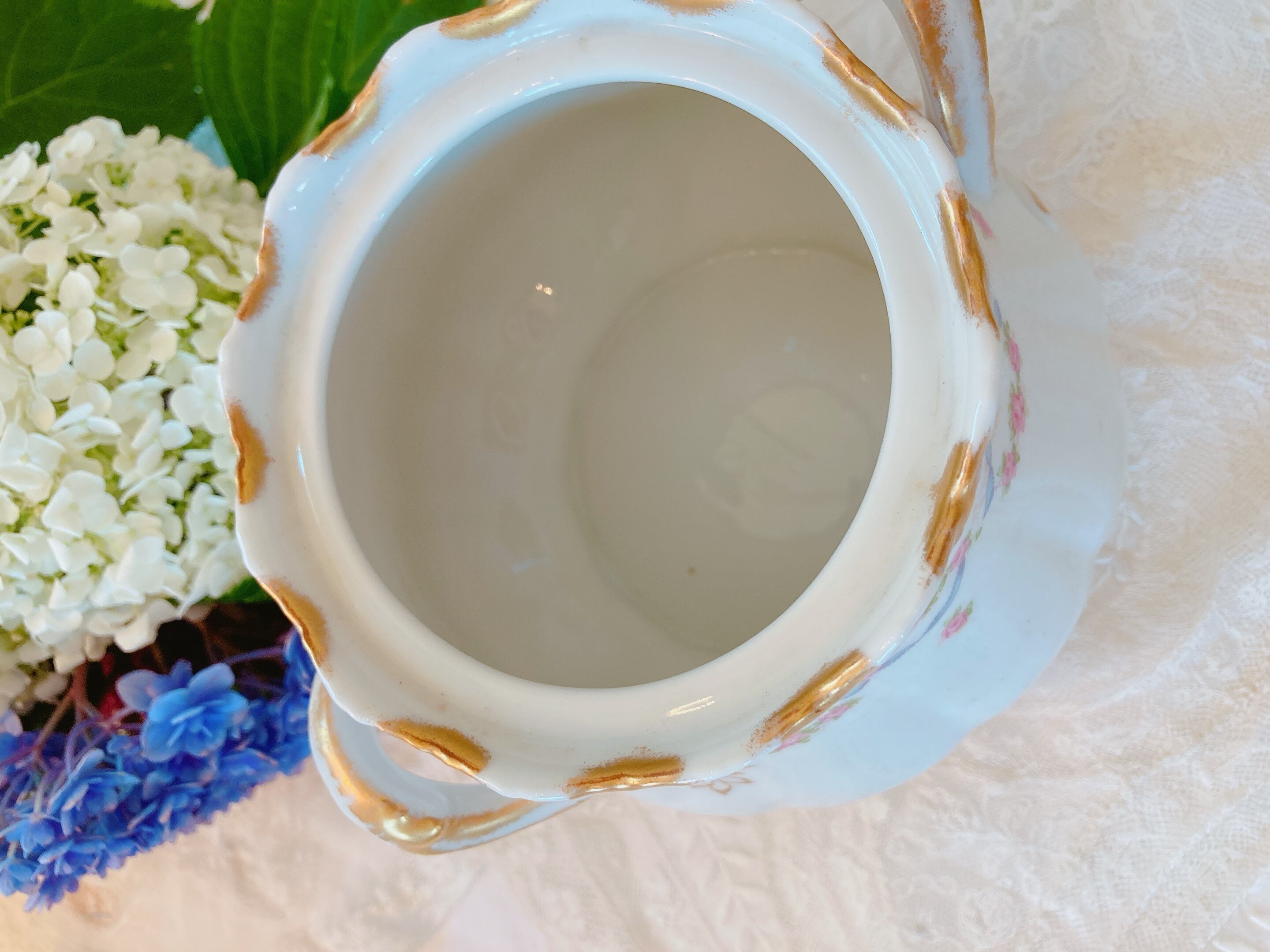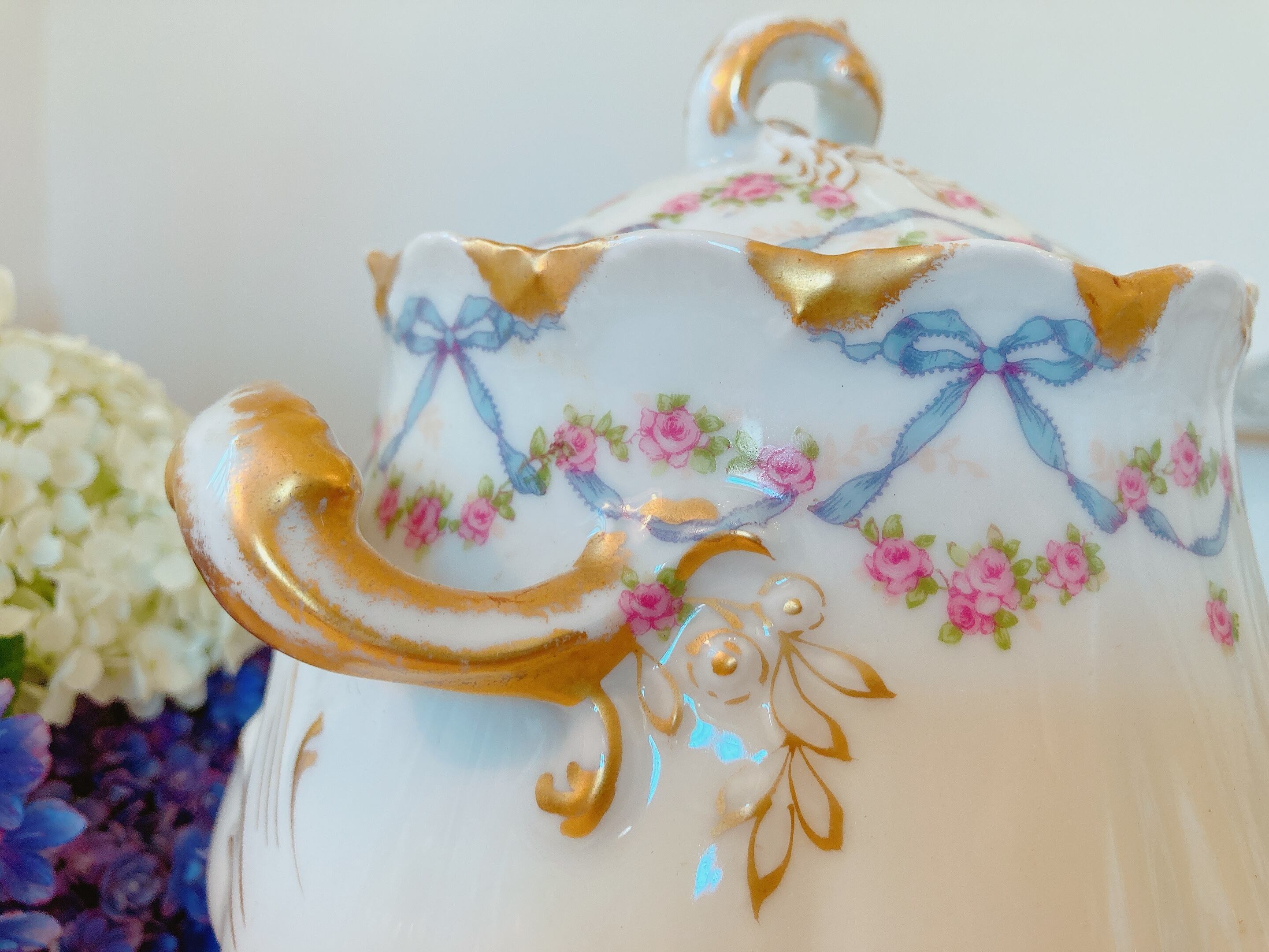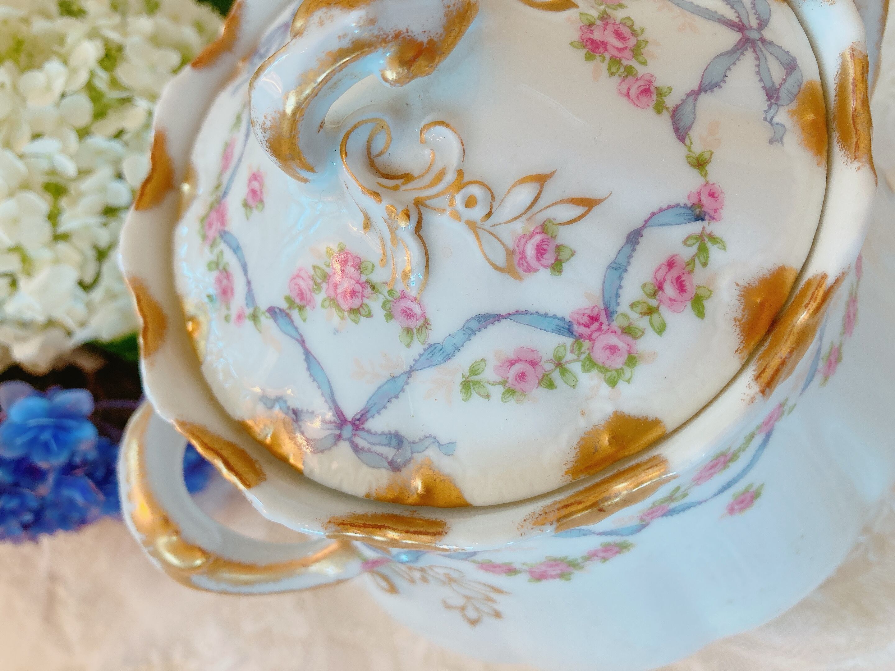 フランスリモージュ ブルーリボンと薔薇のシュガーポット